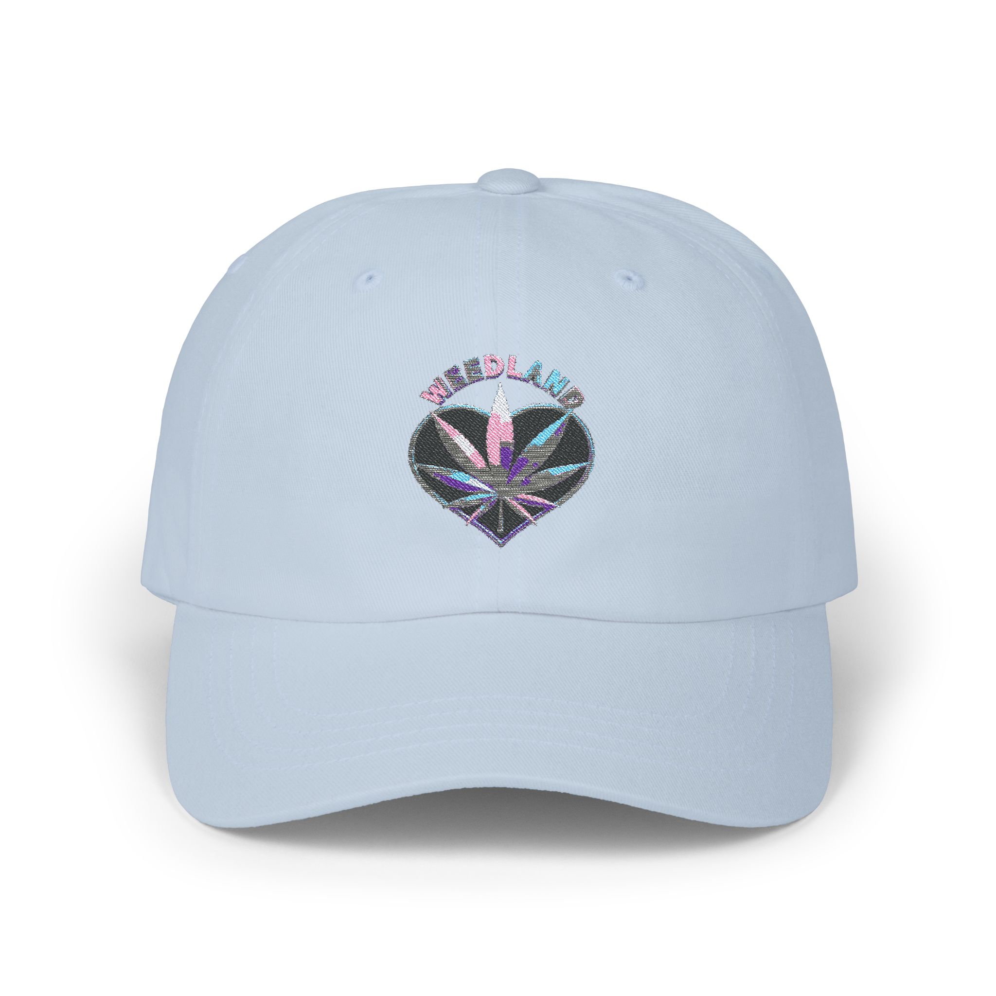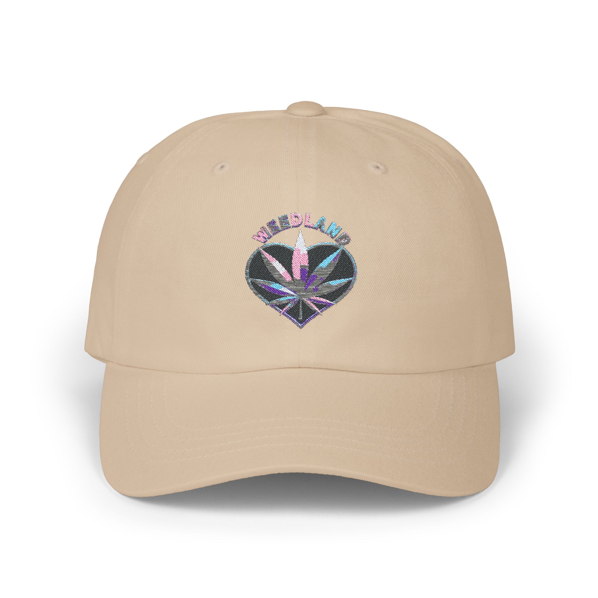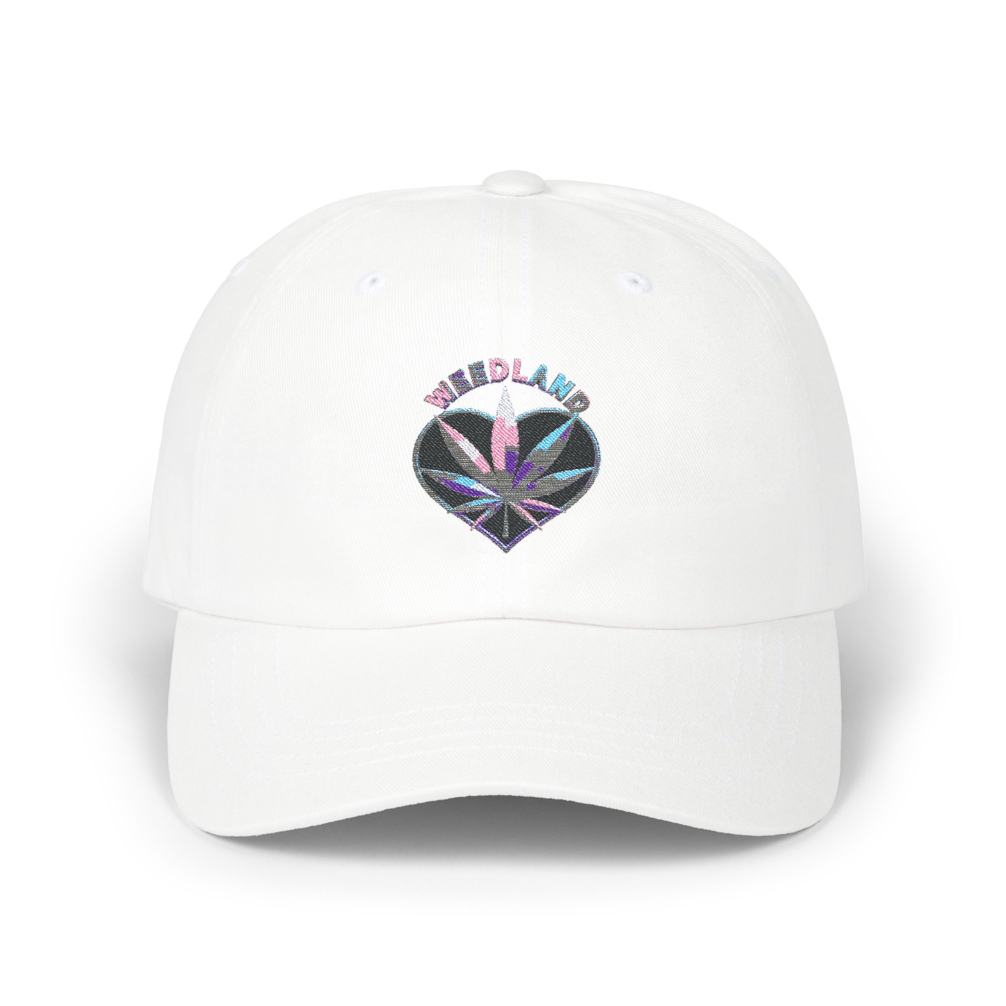 Top off your outfit with this sleek and contemporary white baseball cap featuring a subtle yet striking cannabis leaf design within a heart-shaped emblem. The holographic detailing adds a modern touch, making this cap an ideal accessory for cannabis enthusiasts and trendsetters alike.